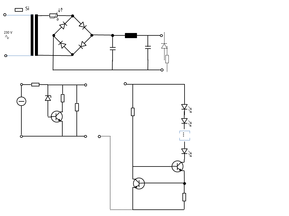Das Bild darunter im linken Bereich zeigt eine Spannungsstabilisierung. Dort wird eine eventuelle Schwankung der Spannung aus der Steckdose ausgeglichen. Die Schaltung besteht aus Widerständen, einer Zenerdiode und einem Transistor. Die Zenerdiode ist das Herz dieser Schaltung, denn an ihr fällt immer die gleiche Spannung ab, so dass der restliche Teil der Schaltung dann dafür sorgt, dass am Ausgang ebenfalls eine konstante Spannung in der gewünschten Höhe bereitgestellt wird.