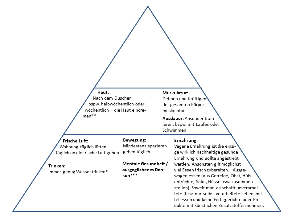 Statt komplizierten Medizinprodukten, Medikamenten oder Ernährungstheorien mit Angaben, welche Proteine, welche Vitamine usw. in welchen Mengen zugeführt werden sollen (ein bisschen kann man sowas natürlich schon im Auge haben), habe ich im Folgenden meine simple Ernährungspyramide aufgestellt. Ich denke man kann vermutlich als absolute Regel aufstellen, dass Medikamente manchmal vielleicht notwändig sind, dass sie aber immer eine Maßnahme sind, die ergriffen wird, wenn vorher Fehler stattgefunden haben. Von Natur aus brauchen wir keine Medikamente. Warum kommen Menschen dann bspw. mit angeborenen Krankheiten auf die Welt und die brauchen doch Medikamente ? Ich vermute, dass dann Fehler durch die Eltern weitergegeben wurden, sei es geschädigtes Erbgut wiederum durch einen geschädigen Körper aufgrund von bspw. falscher Ernährung oder möglicherweise auch Dinge, die sich aus den vorigen Generationen weitervererbt haben.